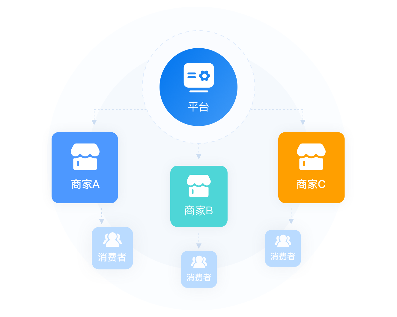 平台作为供应商,建立线上商城系统,招募代理商入驻,代理商通过各自渠道引流,流量不共享,终端消费者需要的商品或服务由平台直接对接。